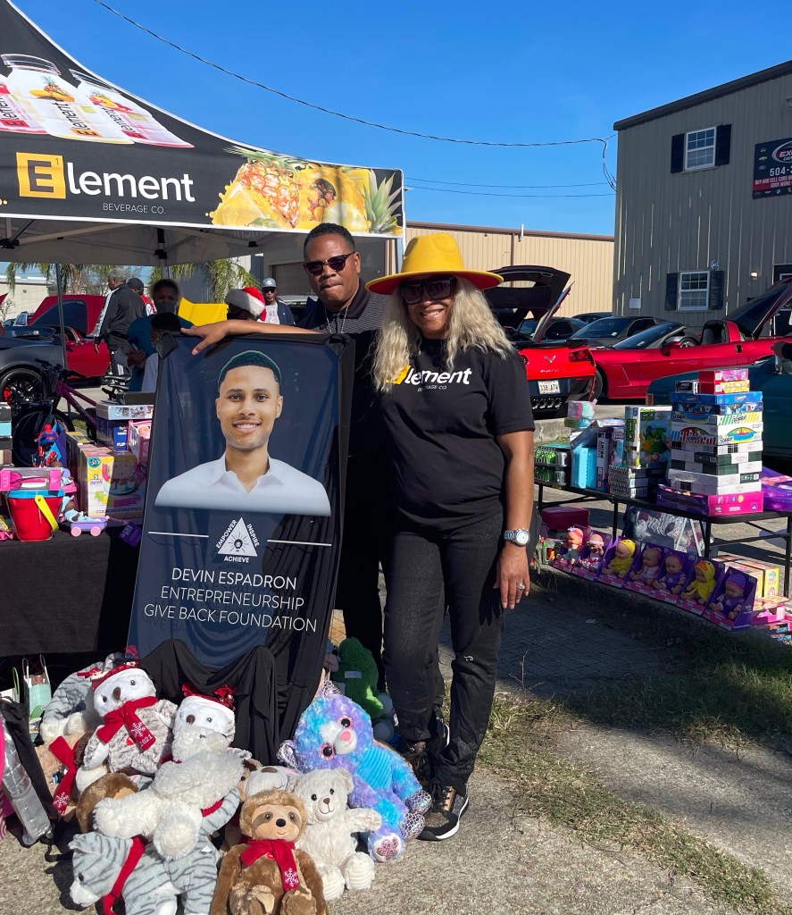 December 24, 2021 – New Orleans, LA – Free dolls, bikes and board games were only a few of the toys offered to families during The Devin Espadron Entrepreneurship Giveback Foundation event in Harvey. Filling cars with unwrapped new toys donated by Element Beverage Co., The Lemonade Diaries Podcast and local contributors, the charity event provided over 400 gifts to excited local kids.